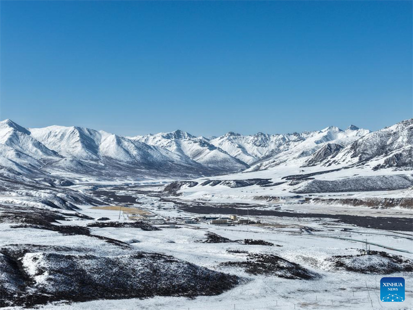 Una fotografía aérea tomada con un dron el 15 de marzo de 2026 muestra el paisaje nevado del distrito de Maqen, en la prefectura autónoma de la etnia tibetana de Golog, provincia de Qinghai, en el noroeste de China. Las montañas cubiertas de nieve bajo el cielo azul ofrecen una magnífica estampa en la meseta. (Xinhua/Zhang Long).