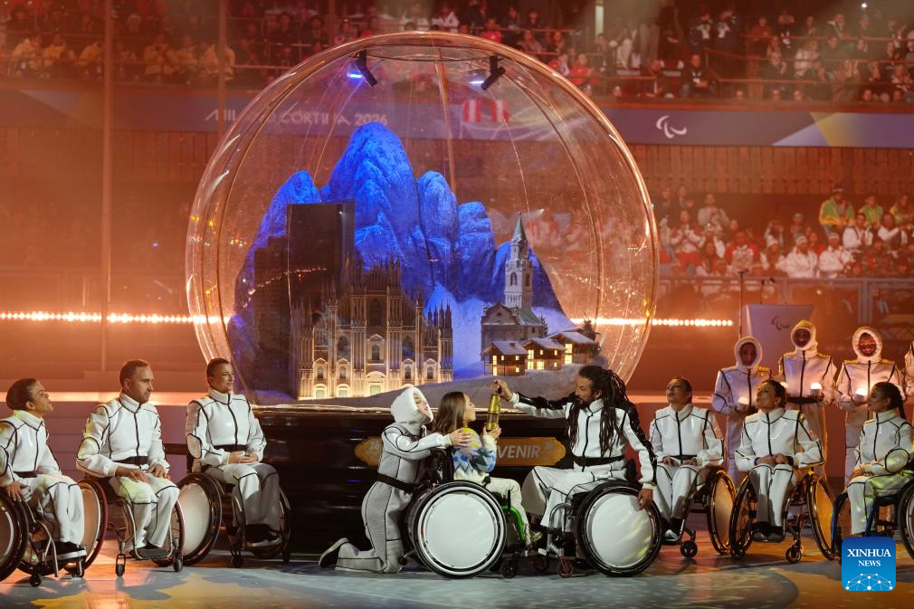 Imagen del 15 de marzo de 2026 de artistas realizando una presentación durante la ceremonia de clausura de los Juegos Paralímpicos de Invierno Milán-Cortina 2026, en Cortina D'ampezzo, Italia. (Xinhua/Mu Yu)