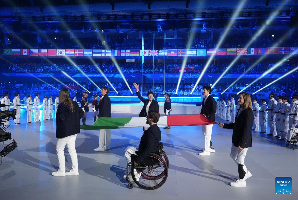 Imagen del 15 de marzo de 2026 de abanderados portando la bandera nacional italiana durante la ceremonia de clausura de los Juegos Paralímpicos de Invierno Milán-Cortina 2026, en Cortina D'ampezzo, Italia. (Xinhua/Hou Jun)