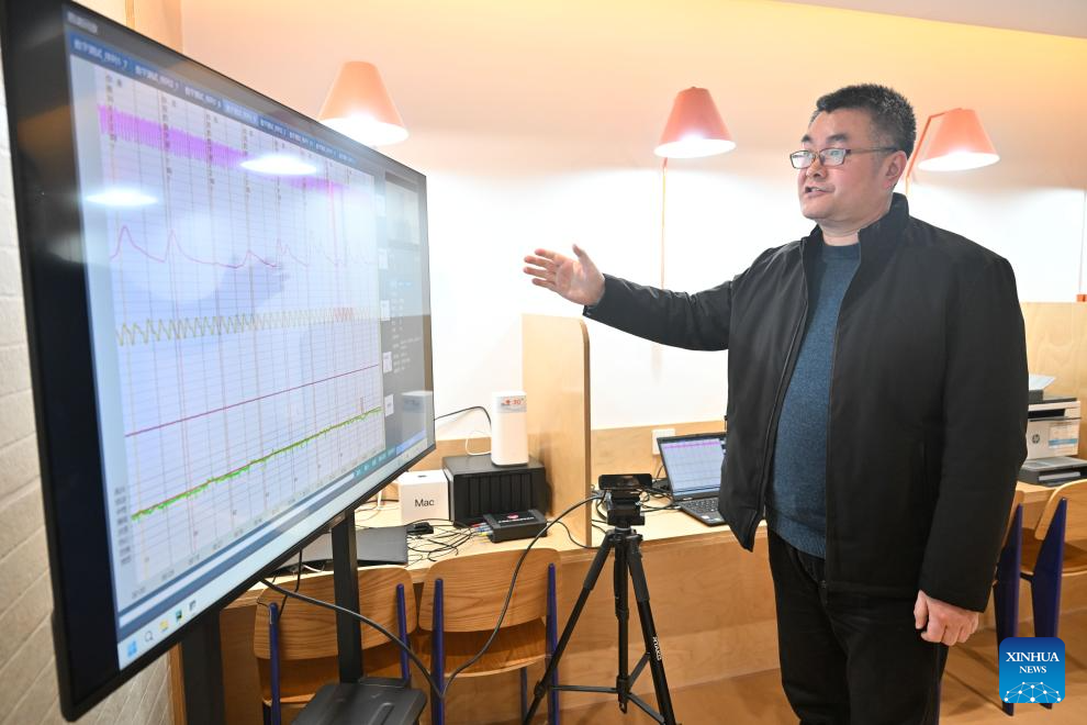 Zuo Binbin, fundador de una empresa emergente tecnológica, informa sobre un sistema de evaluación psicológica multimodal en una comunidad de empresas unipersonales (OPC) en Nanjing, provincia de Jiangsu, en el este de China, el 11 de marzo de 2026. (Xinhua/Ji Chunpeng).