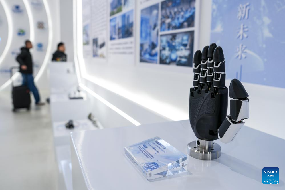 Imagen del 10 de marzo de 2026 de una mano biónica exhibida en el Centro de Innovación de Robótica e Inteligencia Artificial Incorporada de Suzhou, en Suzhou, en la provincia de Jiangsu, en el este de China. En los últimos años, la provincia de Jiangsu, en el este de China, ha priorizado la robótica incorporada como una industria clave para el futuro. (Xinhua/Li Bo)
