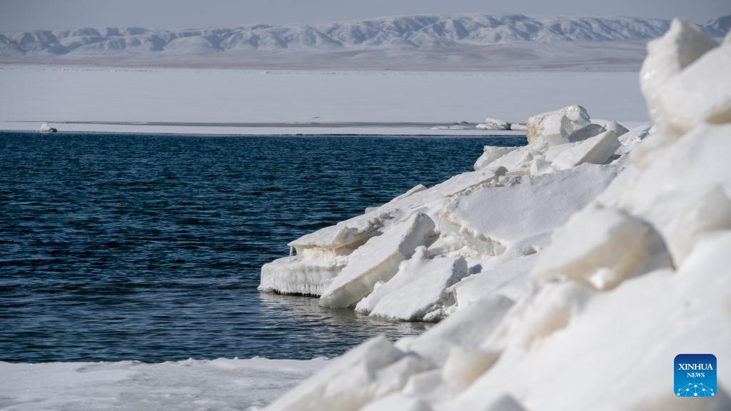 Imagen del 19 de marzo de 2026 de una vista del lago Qinghai, el lago de agua salada interior más grande de China, en la provincia de Qinghai, en el noroeste de China. Con el deshielo de la superficie, el lago Qinghai comienza su temporada de primavera. (Xinhua/Li Linhai)