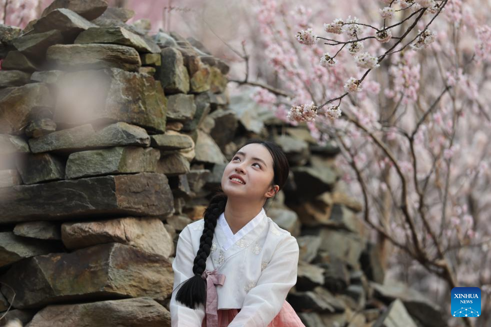 Imagen del 15 de marzo de 2026 de una turista observando flores en un área escénica, en Lianyungang, en la provincia de Jiangsu, en el este de China. (Xinhua/Si Wei)