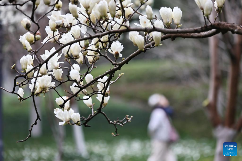 Imagen del 17 de marzo de 2026 de un ciudadano caminando por un parque, en Jiaxing, en la provincia de Zhejiang, en el este de China. (Xinhua/Jin Peng)