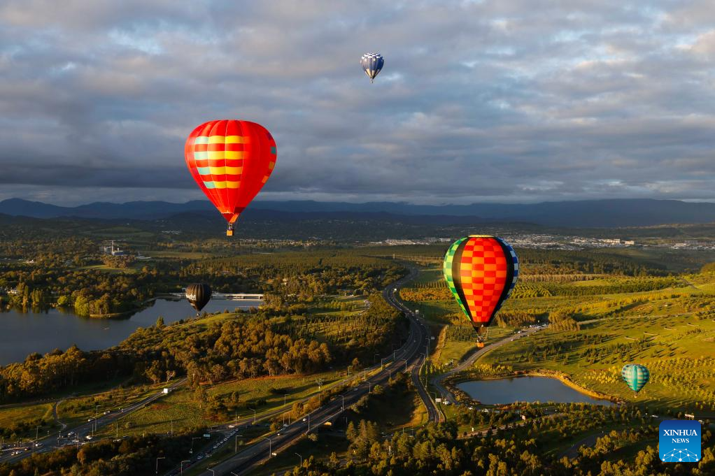 Globos aerostáticos vuelan en el cielo durante el espectáculo anual de Globos de Canberra, en Canberra, Australia, el 22 de marzo de 2026. El evento se celebró aquí del 14 al 22 de marzo de este año. (Xinhua/Chu Chen)