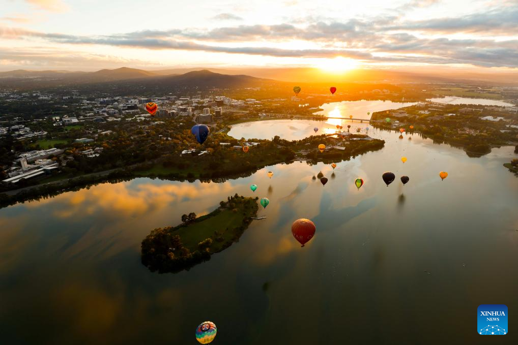 Globos aerostáticos vuelan sobre el lago Burley Griffin durante el espectáculo anual de Globos de Canberra, en Canberra, Australia, el 22 de marzo de 2026. El evento se celebró aquí del 14 al 22 de marzo de este año. (Xinhua/Chu Chen)