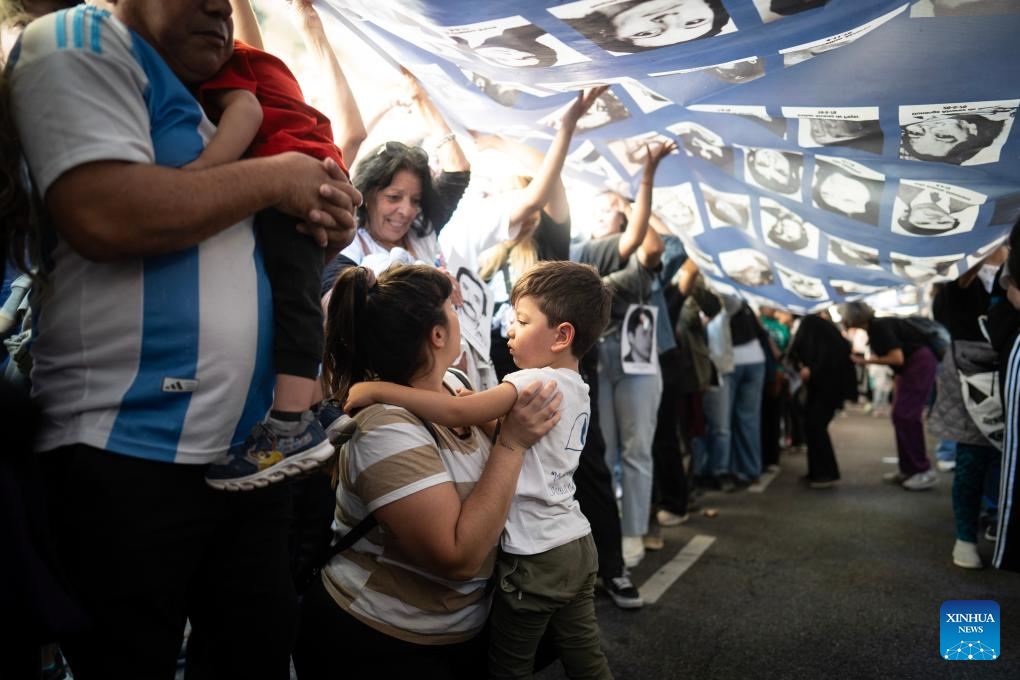 Una mujer reacciona junto a su hijo durante una marcha para conmemorar el Día Nacional de la Memoria por la Verdad y la Justicia, en la ciudad de Buenos Aires, capital de Argentina, el 24 de marzo de 2026. Miles de personas, junto con representantes de organismos de derechos humanos, colectivos sociales y agrupaciones políticas, se movilizan el martes a la emblemática Plaza de Mayo, en el centro de la ciudad de Buenos Aires, para conmemorar el Día Nacional de la Memoria por la Verdad y la Justicia, al cumplirse 50 años del golpe de Estado del 24 de marzo de 1976, que instaló una junta militar y gobernó el país hasta el 10 de diciembre de 1983. (Xinhua/Martín Zabala)