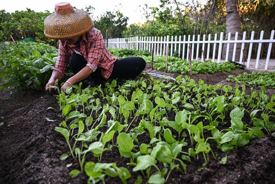 Una agricultora planta plántulas en la isla de Zhaoshu, en Sansha, provincia de Hainan, al sur de China, el 19 de marzo de 2026. (Xinhua/Pu Xiaoxu).