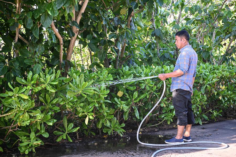 Un empleado riega las plantas en la isla de Zhaoshu, en Sansha, provincia de Hainan, sur de China, el 19 de marzo de 2026. (Xinhua/Pu Xiaoxu).