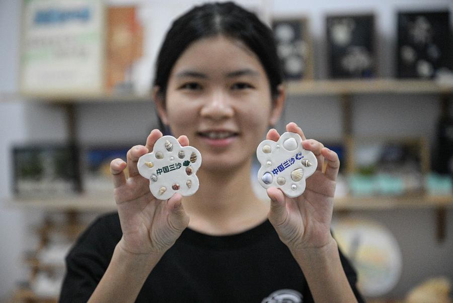 Una residente muestra imanes de nevera hechos a mano en una tienda de la isla de Zhaoshu, en Sansha, provincia de Hainan, sur de China, el 19 de marzo de 2026. (Xinhua/Liu Lianfen).
