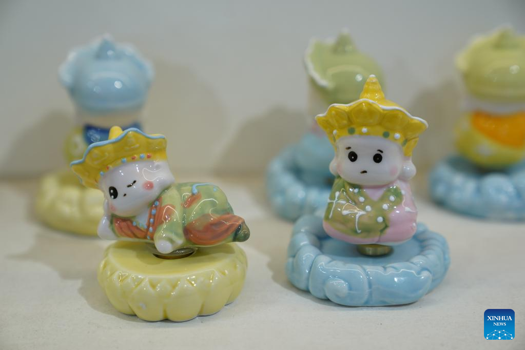 Productos culturales y creativos inspirados en el «Buda sin palabras» en el estudio de Zeng Rui en Jingdezhen, provincia de Jiangxi, al este de China, 12 de marzo de 2026. (Xinhua/Zhou Mi).