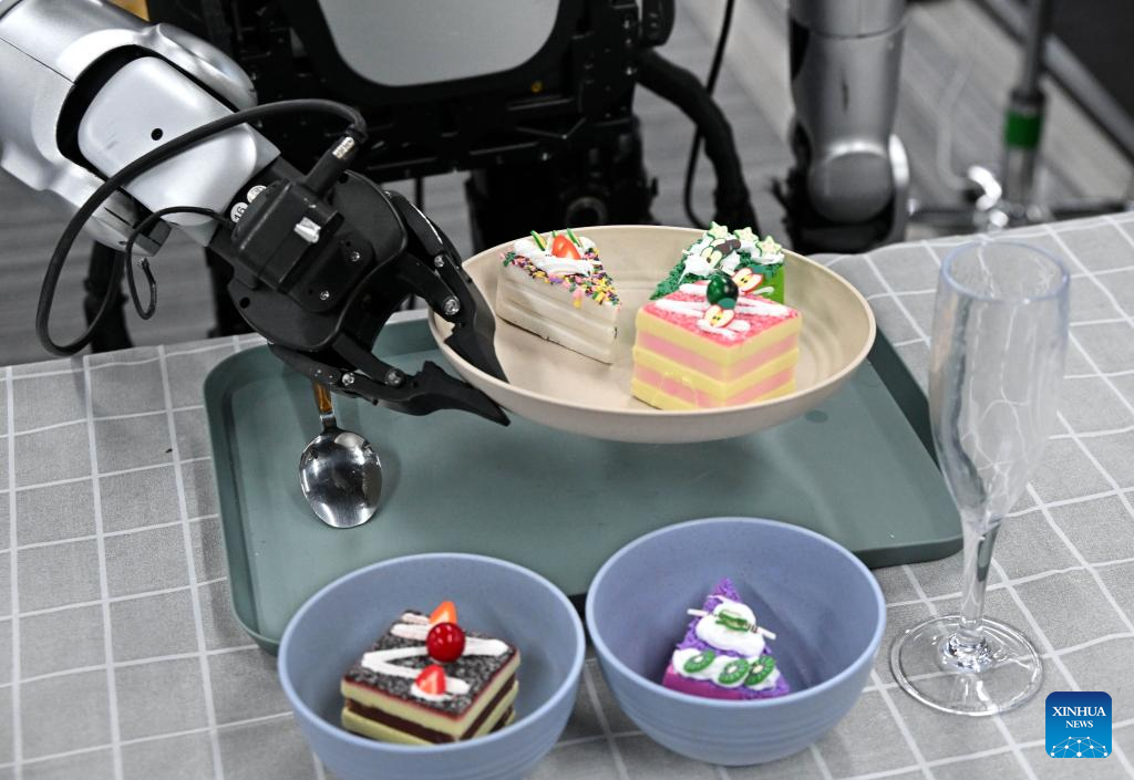Imagen del 23 de marzo de 2026 de un robot humanoide entrenando y recopilando datos en el Centro de Entrenamiento de Datos para Robots Humanoides de Qingdao, en el distrito de Laoshan de Qingdao, en la provincia de Shandong, en el este de China. Ubicado en el distrito de Laoshan de la ciudad, el Centro de Entrenamiento de Datos para Robots Humanoides de Qingdao está equipado con escenarios de recopilación de datos para robots humanoides, tales como la fabricación industrial inteligente, el hogar inteligente y los servicios comerciales, lo que proporciona apoyo para la investigación y el desarrollo relacionados con los robots humanoides. (Xinhua/Li Ziheng)