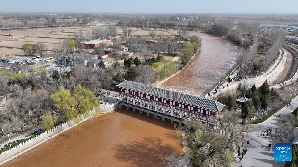 Vista aérea tomada con un dron el 24 de marzo de 2026 de una compuerta de esclusa abierta que desvía agua del río Amarillo para el riego, en Qingtongxia, en la región autónoma de la etnia hui de Ningxia, en el noroeste de China. (Xinhua/Wang Peng)
