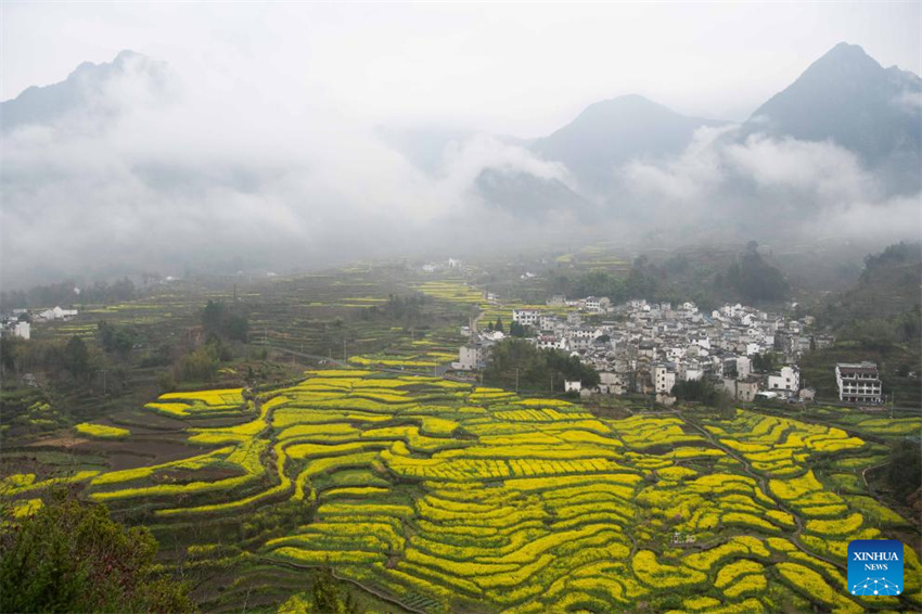 Esta fotografía, tomada el 23 de marzo de 2026, muestra el paisaje de los campos de colza en la aldea de Xingfu, distrito de Jixi, ciudad de Xuancheng, provincia de Anhui, en el este de China. (Xinhua/Zhang Duan).