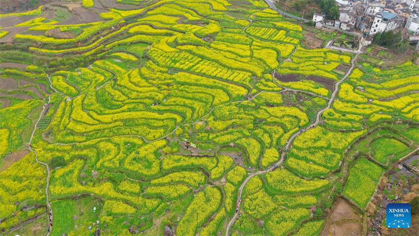 Esta fotografía aérea tomada con un dron el 22 de marzo de 2026 muestra el paisaje de los campos de flores de colza en la aldea de Xingfu, distrito de Jixi, ciudad de Xuancheng, provincia de Anhui, en el este de China. (Foto de Luo Congyi/Xinhua).