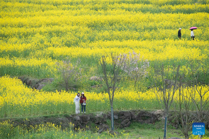 Unas turistas contemplan las flores de colza en la aldea de Xingfu, en el distrito de Jixi, ciudad de Xuancheng, provincia de Anhui, al este de China, el 22 de marzo de 2026. (Xinhua/Zhang Duan).