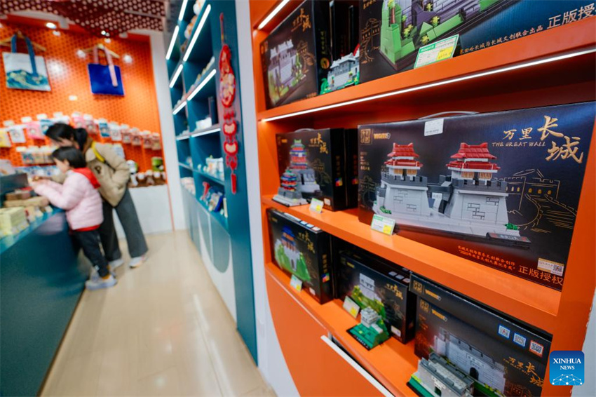 La gente observa productos culturales y creativos en una tienda de la sección de Mutianyu de la zona turística de la Gran Muralla en Beijing, el 21 de marzo de 2026. (Xinhua/Chen Yehua).