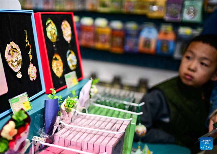 Un niño observa productos culturales y creativos en una tienda de la sección de Mutianyu de la zona turística de la Gran Muralla en Beijing, el 21 de marzo de 2026. (Xinhua/Chen Yehua).