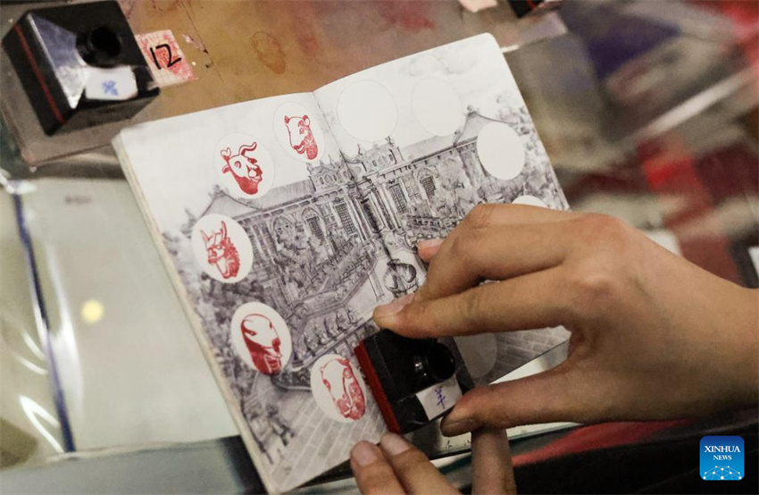 Un turista sella un librito en el Antiguo Palacio de Verano (Yuanmingyuan) de Beijing, el 23 de marzo de 2026. (Xinhua/Zhang Fan).