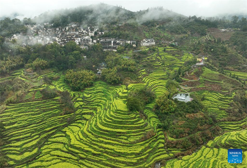 Una fotografía aérea tomada con un dron el 24 de marzo de 2026 muestra los campos de colza en terrazas en el paraje turístico de Huangling, en el distrito de Wuyuan, provincia de Jiangxi, al este de China. (Xinhua/Wan Xiang).