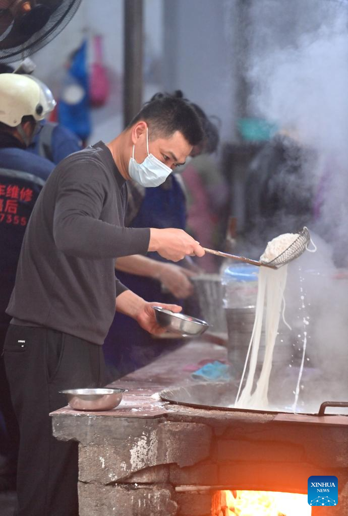 Un empleado prepara lyufen en un restaurante del distrito autónomo de la etnia miao de Rongshui, en la ciudad de Liuzhou, región autónoma de la etnia zhuang de Guangxi, al sur de China, el 25 de marzo de 2026. (Xinhua/Huang Xiaobang).