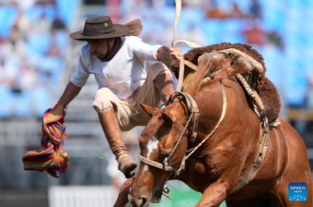 Un gaucho se cae de un caballo en las jineteadas durante la 99 edición de la Semana Criolla del Prado, en el rodeo de la Rural del Prado, en Montevideo, capital de Uruguay, el 30 de marzo de 2026. (Xinhua/Nicolás Celaya)