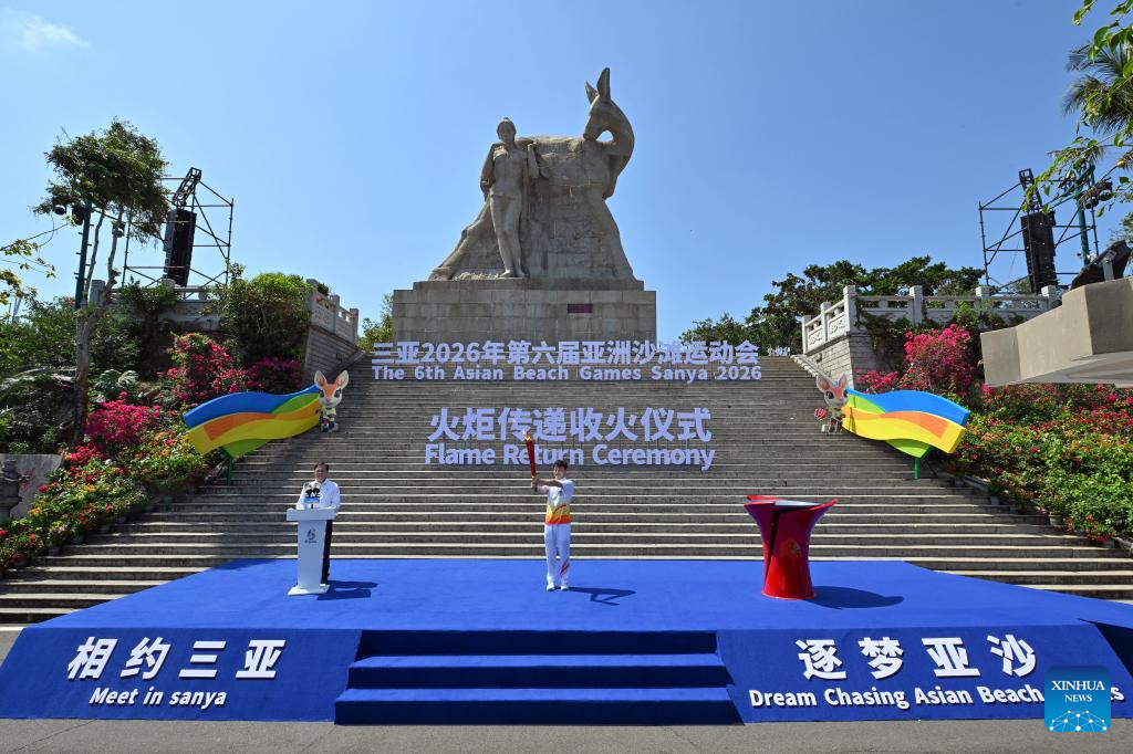 El esquiador chino de saltos acrobáticos Qi Guangpu sostiene la antorcha durante la ceremonia de devolución de la antorcha de los VI Juegos Asiáticos de Playa Sanya 2026 en Sanya, provincia de Hainan, en el sur de China, el 30 de marzo de 2026. (Xinhua/Guo Cheng).
