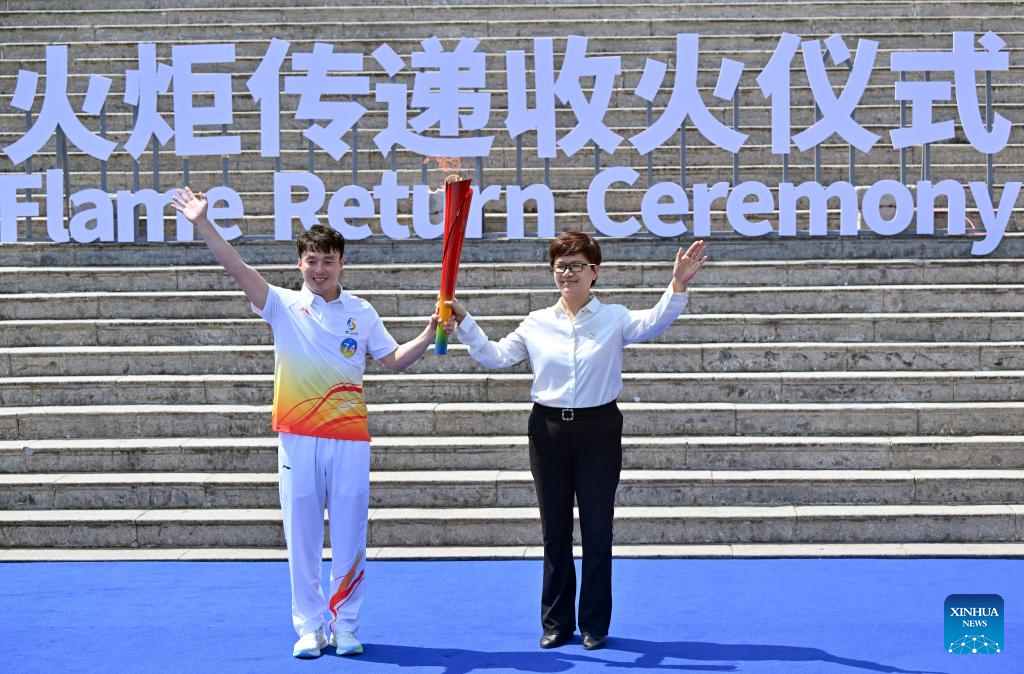 El esquiador chino de saltos acrobáticos Qi Guangpu (izquierda) sostiene la antorcha durante la ceremonia de devolución de la antorcha de los VI Juegos Asiáticos de Playa Sanya 2026 en Sanya, provincia de Hainan, al sur de China, el 30 de marzo de 2026. (Xinhua/Guo Cheng).