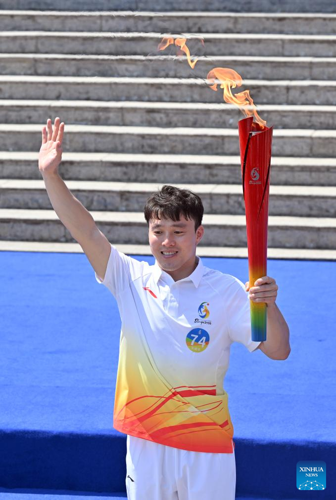 El esquiador chino de saltos acrobáticos Qi Guangpu sostiene la antorcha durante la ceremonia de devolución de la antorcha de los VI Juegos Asiáticos de Playa Sanya 2026 en Sanya, provincia de Hainan, al sur de China, el 30 de marzo de 2026. (Xinhua/Guo Cheng).