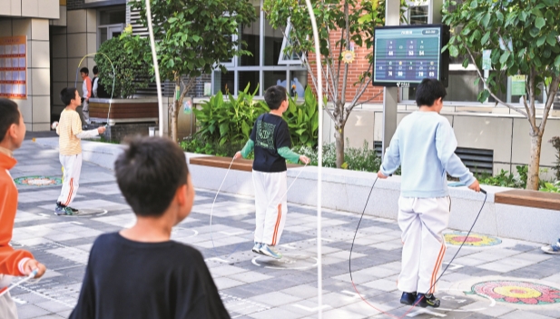 13 de octubre de 2025. Estudiantes practican salto de cuerda frente a un nuevo sistema de educación física inteligente con IA en la Escuela Primaria No.1 de Zhongguancun. Wei Yao