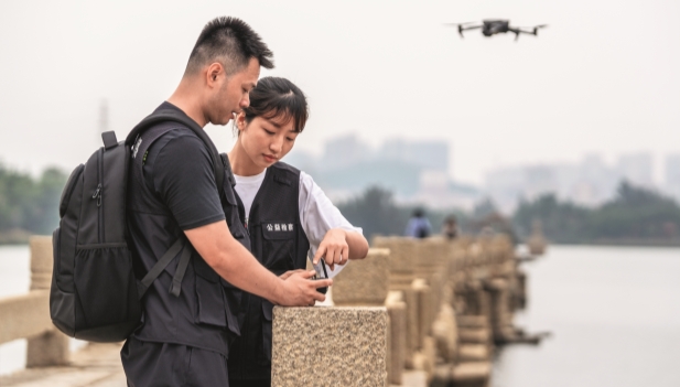 Noviembre 2023. Fiscales del Departamento de Litigios de Interés Público de la Fiscalía Popular de Jinjiang, en la provincia de Fujian, utilizan un dron para recabar pruebas durante una investigación medioambiental. Foto de cortesía