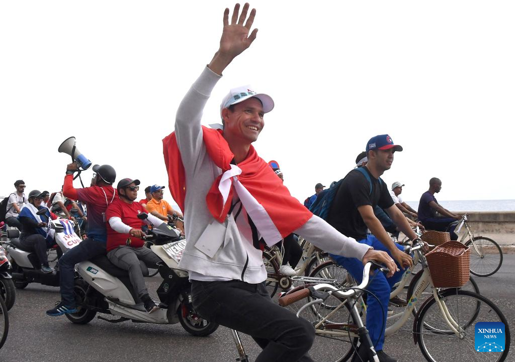 Personas participan en una movilización en el Malecón, en La Habana, capital de Cuba, el 2 de abril de 2026. Cientos de jóvenes y pioneros cubanos recorrieron el jueves el Malecón de La Habana, en la capital del país, en la Parada Juvenil Antiimperialista "Aquí, con Fidel", una movilización sobre ruedas que combinó el homenaje al líder político Fidel Castro, en el centenario de su nacimiento, con el rechazo al bloqueo que impone Estados Unidos a la isla. (Xinhua/Joaquín Hernández)