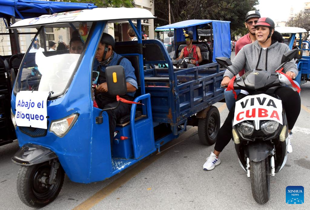 Personas a bordo de vehículos participan en una movilización en el Malecón, en La Habana, capital de Cuba, el 2 de abril de 2026. Cientos de jóvenes y pioneros cubanos recorrieron el jueves el Malecón de La Habana, en la capital del país, en la Parada Juvenil Antiimperialista "Aquí, con Fidel", una movilización sobre ruedas que combinó el homenaje al líder político Fidel Castro, en el centenario de su nacimiento, con el rechazo al bloqueo que impone Estados Unidos a la isla. (Xinhua/Joaquín Hernández)