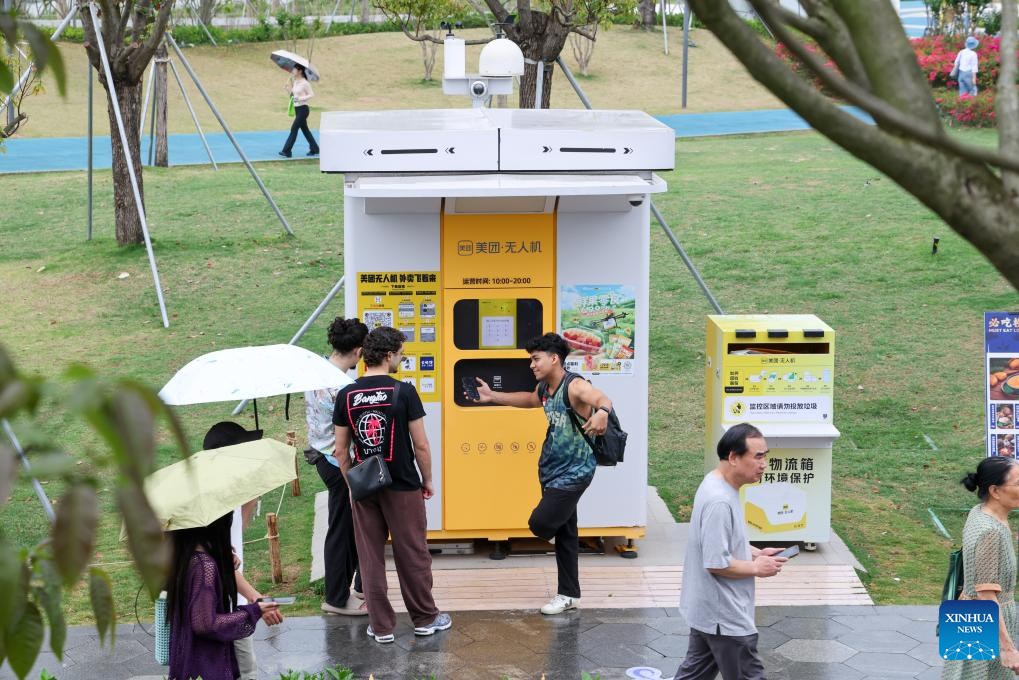 Turistas extranjeros se informan sobre los servicios de reparto con drones en el parque deportivo de Bijiashan, en Shenzhen, el 27 de marzo de 2026. (Xinhua/Liang Xu).