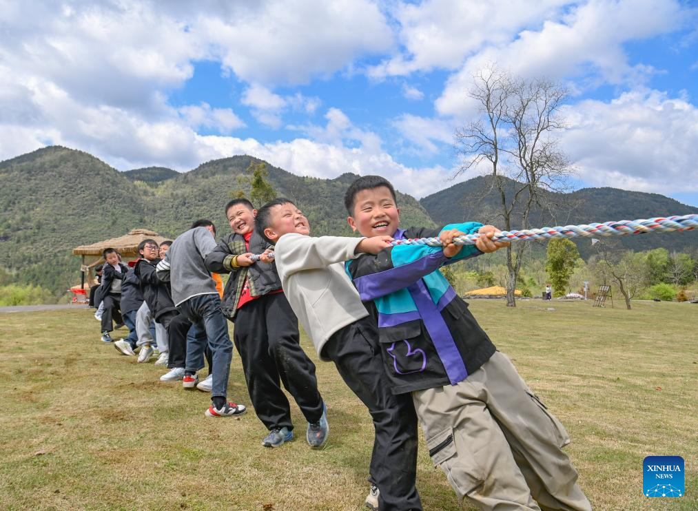 Imagen del 3 de abril de 2026 de niños asistiendo a un juego de jalar la cuerda en el área escénica de Dieshihuagu, en el distrito autónomo tujia y miao de Youyang, en Chongqing, en el suroeste de China. Las primeras vacaciones de primavera del país para escuelas primarias y secundarias cayó justo antes del feriado de tres días del Festival Qingming, que va del sábado al lunes, en muchas localidades. Los estudiantes tuvieron la oportunidad de participar en una variedad de actividades de ocio. (Xinhua/Ran Chuan)