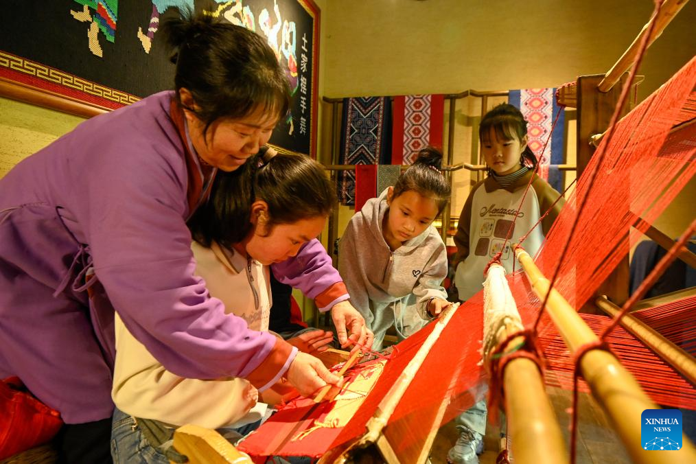 Imagen del 3 de abril de 2026 de niños aprendiendo sobre las habilidades de tejido de brocado tujia bajo la guía de un heredero del patrimonio cultural inmaterial (ICH, por sus siglas en inglés) en un taller de brocado del ICH en el área escénica de Taohuayuan, en el distrito autónomo tujia y miao de Youyang, en Chongqing, en el suroeste de China. Las primeras vacaciones de primavera del país para escuelas primarias y secundarias cayó justo antes del feriado de tres días del Festival Qingming, que va del sábado al lunes, en muchas localidades. Los estudiantes tuvieron la oportunidad de participar en una variedad de actividades de ocio. (Xinhua/Qiu Hongbin)