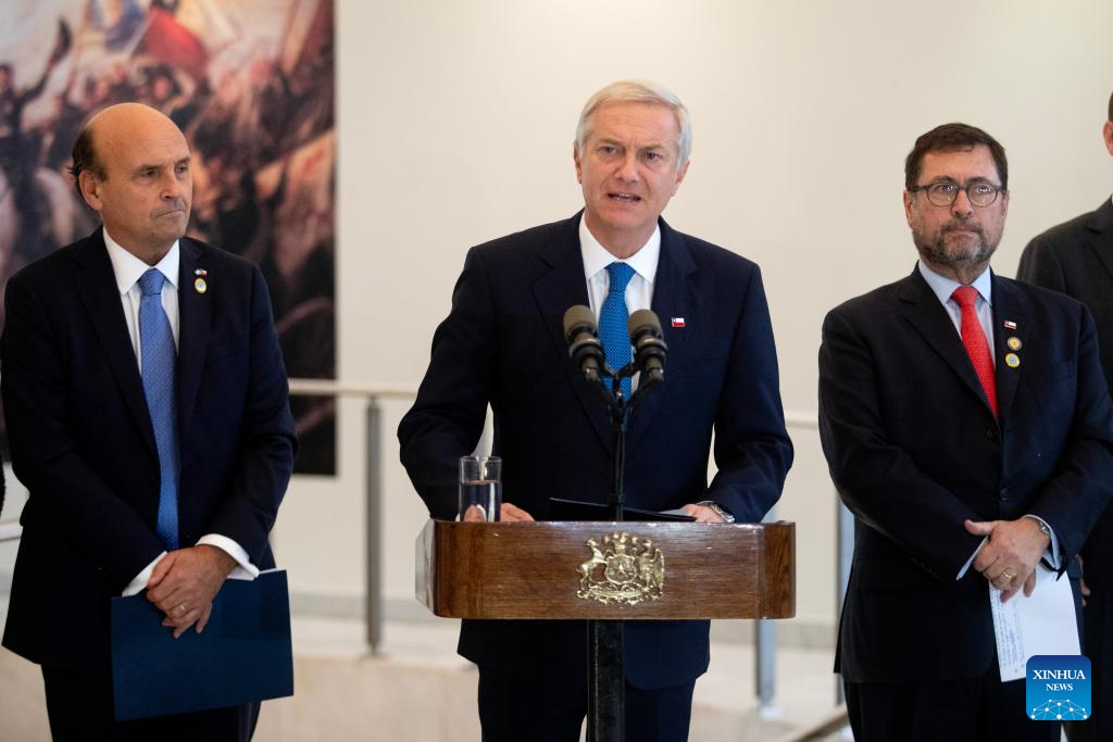 El presidente chileno, José Antonio Kast (c), habla junto al ministro de Relaciones Exteriores chileno, Francisco Pérez Mackenna (d), y al embajador de Chile en Argentina, Gonzalo Uriarte Herrera (i), durante una conferencia de prensa en la sede de la Embajada de Chile en Argentina, en la ciudad de Buenos Aires, capital de Argentina, el 6 de abril de 2026. El presidente de Argentina, Javier Milei, recibió el lunes en la Casa de Gobierno a su homólogo de Chile, José Antonio Kast, con objeto de establecer las prioridades de la relación bilateral. (Xinhua/Martín Zabala)