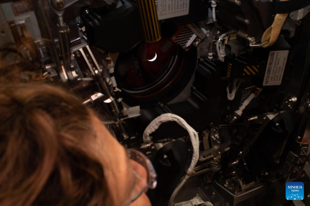 La astronauta de la NASA, Christina Koch, observa por una de las ventanillas de la nave espacial Orión hacia la Tierra, el 6 de abril de 2026. La tripulación de la misión Artemis II batió el lunes el récord de la mayor distancia de la Tierra a la que hayan llegado los seres humanos, al superar el hito logrado por Apolo 13 en abril de 1970, indicó la NASA. (Xinhua/NASA)