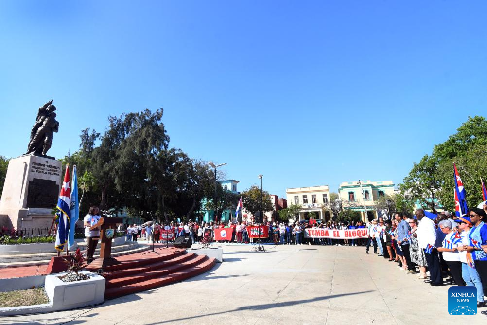 La secretaria general de la Federación de Mujeres Cubanas, Teresa Amarelle (i), y el vicepresidente cubano, Salvador Valdés Mesa (5-d), participan en una jornada llevada a cabo para denunciar el bloqueo económico de Estados Unidos a Cuba, en La Habana, capital de Cuba, el 7 de abril de 2026. Cientos de mujeres cubanas se reunieron el martes en un parque del centro de La Habana, la capital de Cuba, para denunciar el bloqueo económico que Estados Unidos impone al país caribeño desde hace más de seis décadas.(Xinhua/Joaquín Hernández)