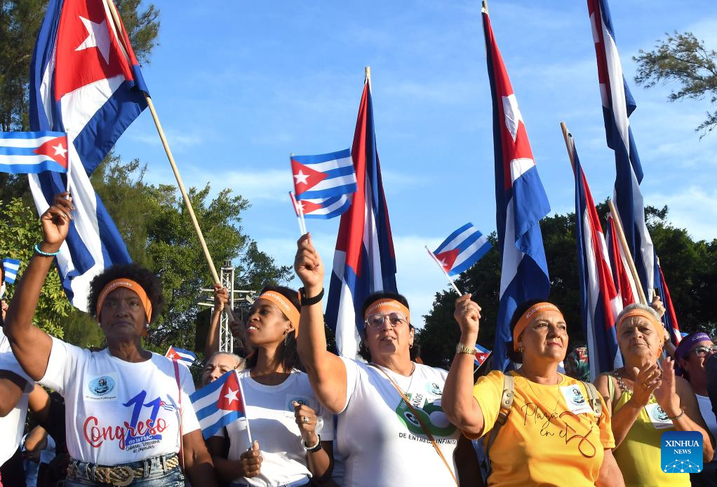 Mujeres sostienen banderas durante una jornada llevada a cabo para denunciar el bloqueo económico de Estados Unidos a Cuba, en La Habana, capital de Cuba, el 7 de abril de 2026. Cientos de mujeres cubanas se reunieron el martes en un parque del centro de La Habana, la capital de Cuba, para denunciar el bloqueo económico que Estados Unidos impone al país caribeño desde hace más de seis décadas. (Xinhua/Joaquín Hernández)