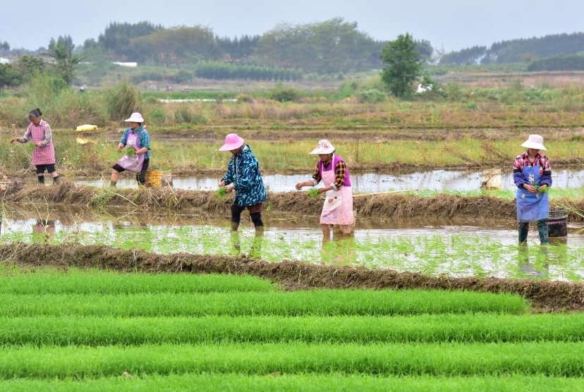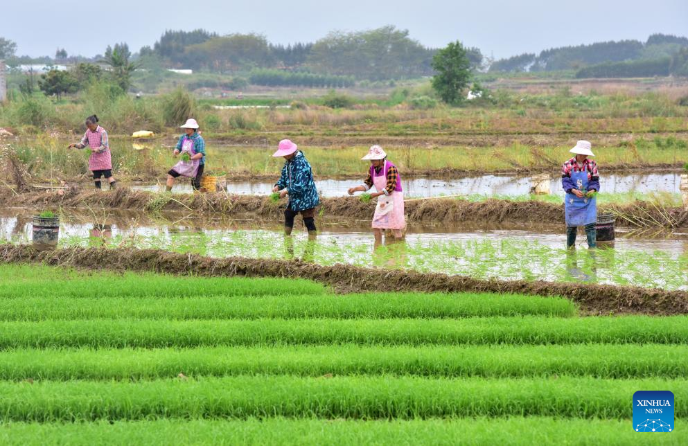 Imagen del 7 de abril de 2026 de agricultores plantando arroz de temporada temprana en un campo, en el distrito autónomo yao de Fuchuan, en la región autónoma de la etnia zhuang de Guangxi, en el sur de China. (Xinhua/Liao Zuping)