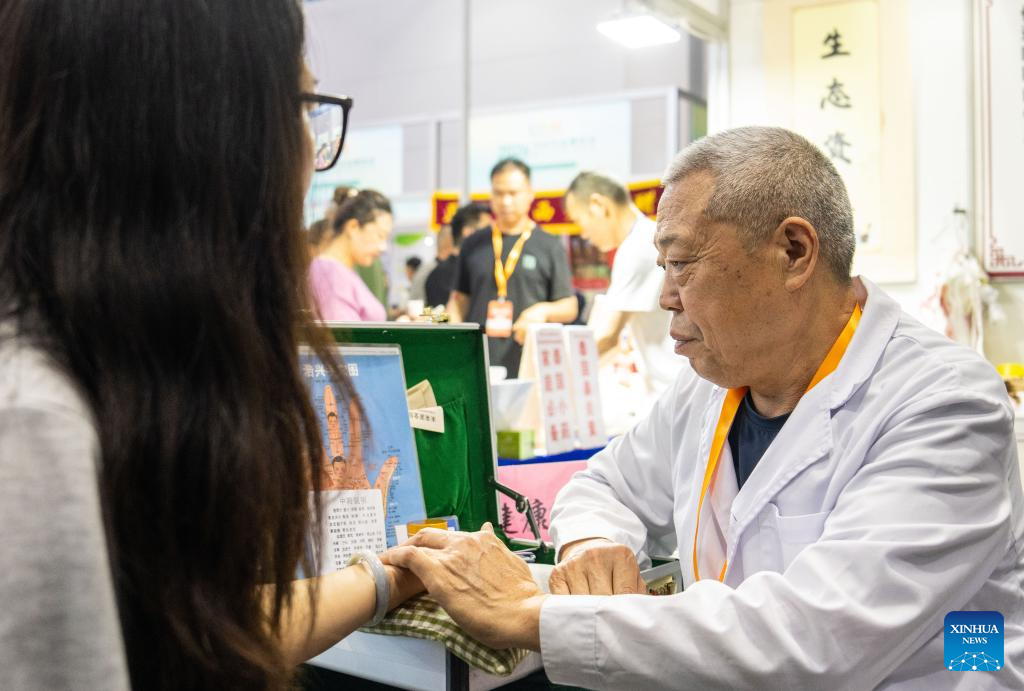 Un doctor de Medicina Tradicional China realiza un diagnóstico de pulso para una visitante en la Exposición Agrícola de Medicina China en el Centro Internacional de Convenciones y Exposiciones de Hunan, en Changsha, en la provincia de Hunan, en el centro de China, el 10 de abril de 2026. Con un área de exposición total de 20.000 metros cuadrados, la primera edición de la Exposición Agrícola de Medicina China comenzó aquí el viernes, reuniendo a más de 300 expositores de todo el país. (Xinhua/Chen Sihan)