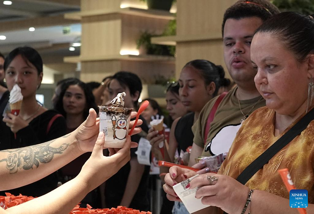 SAO PAULO, 11 abril, 2026 (Xinhua) -- Una clienta recibe un helado que ordenó en la primera tienda china Mixue en Brasil durante su inauguración en un centro comercial, en Sao Paulo, Brasil, el 11 de abril de 2026. Mixue abrió su primera tienda en Brasil y según un representante de la empresa también comenzará la construcción de una fábrica para su cadena de suministro en el país. Se espera que genere 25.000 empleos en el futuro. (Xinhua/Paulo Lopes)