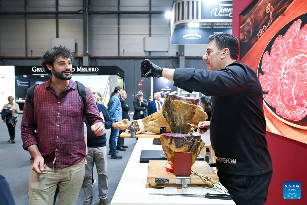 Un expositor entrega una muestra de cecina a un visitante durante el Salón Gourmets, en Madrid, España, el 13 de abril de 2026. El 39 Salón Gourmets se celebra en Madrid del 13 al 16 de abril. (Xinhua/Gustavo Valiente)