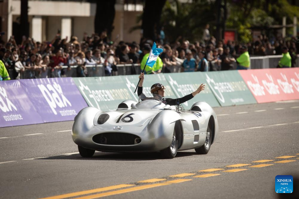 El piloto argentino de Fórmula 1, Franco Colapinto, saluda desde una réplica del Mercedes-Benz W196 conocido como la "Flecha de Plata", sobre la avenida Del Libertador durante una exhibición, en la ciudad de Buenos Aires, capital de Argentina, el 26 de abril de 2026. La multitud vibró el domingo en Buenos Aires, capital de Argentina, con la exhibición del piloto argentino de Fórmula 1, Franco Colapinto, en un evento que reunió a medio millón de personas y convirtió las calles de la ciudad en un escenario de velocidad, historia y fervor por el automovilismo. (Xinhua/Martín Zabala)
